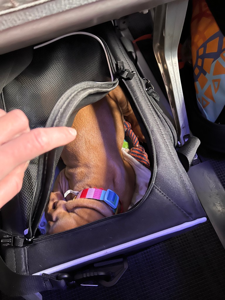 We got some beautiful views on that drive to Portland, and somehow, Tui made the whole travel experience feel easy. He slept most of the flight too – though he did howl in protest when we put him in the travel carrier to board. We were so nervous they’d kick us off the flight! But as soon as we got to our seats, he settled in and slept the rest of the way.