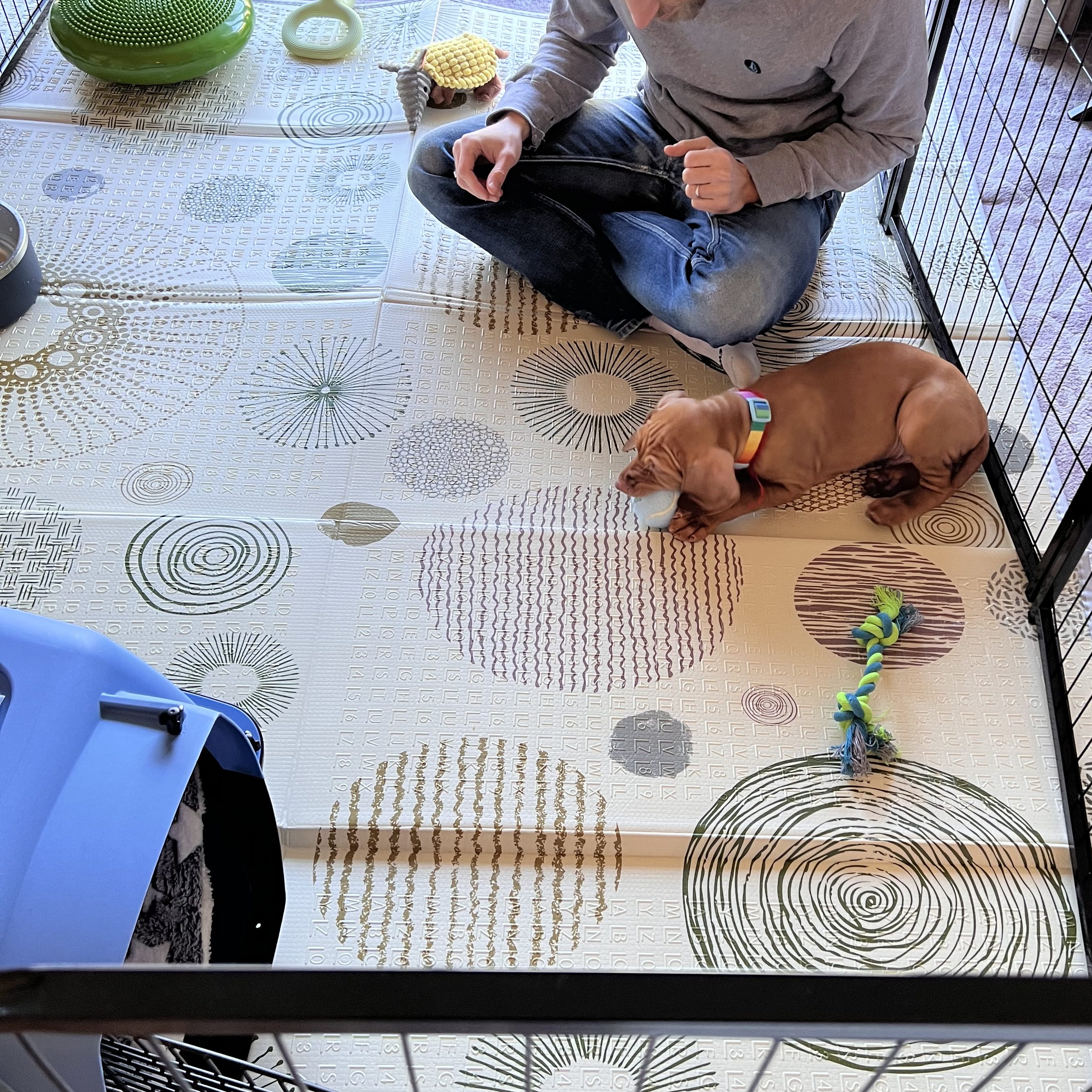 When we got home, we took him to his potty spot outside, and then let him explore his new space – just his pen area, toys, and crate to start.
